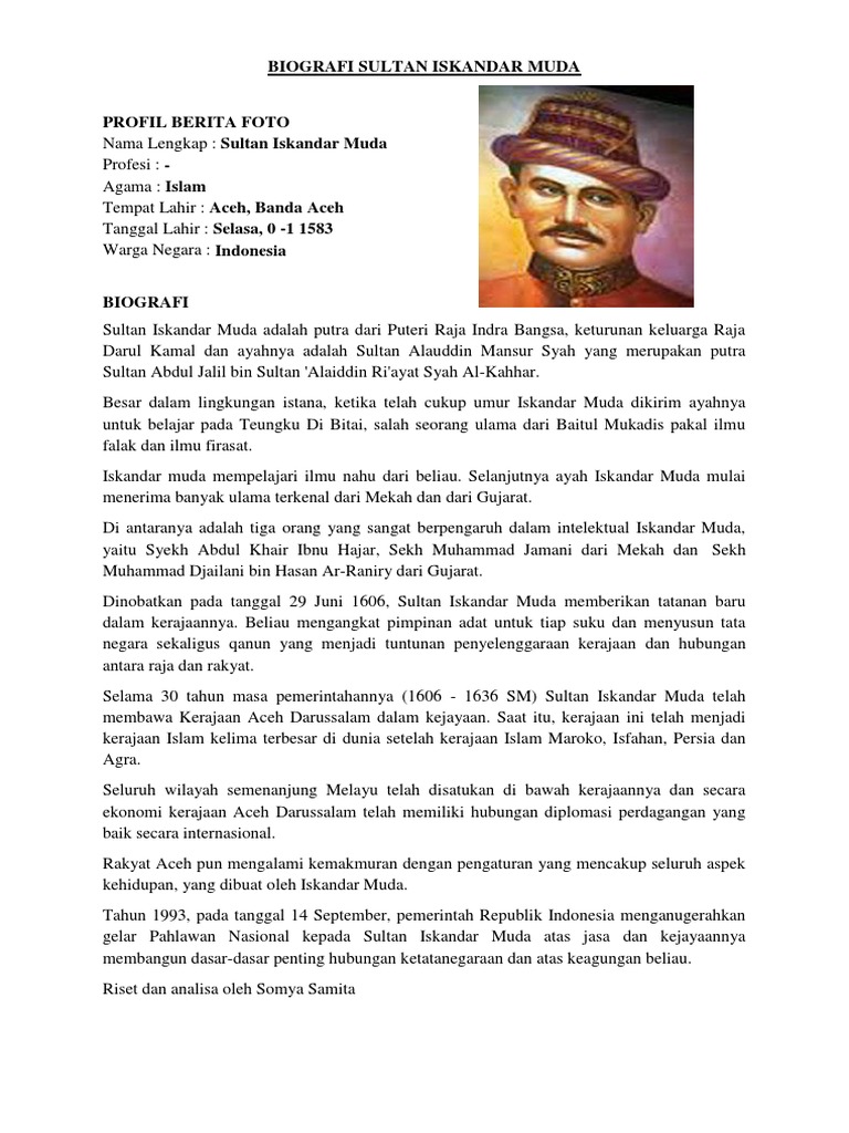 Biografi sultan iskandar muda lengkap. The future Iskandar Muda was born in about 1583. Nama Lengkap Sultan Iskandar Muda Alias No Alias Agama Islam Tempat Lahir Aceh Banda Aceh Tanggal Lahir Selasa 0 1583 Zodiak-Warga Negara Indonesia Relation-Biografi. Beliau merupakan sultan terbesar selama masa Kesultanan Aceh di tahun 1607 sampai 1636.